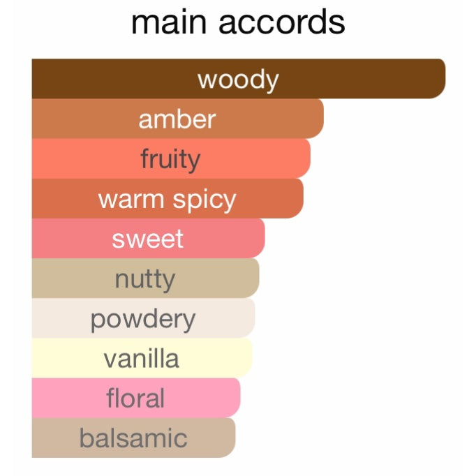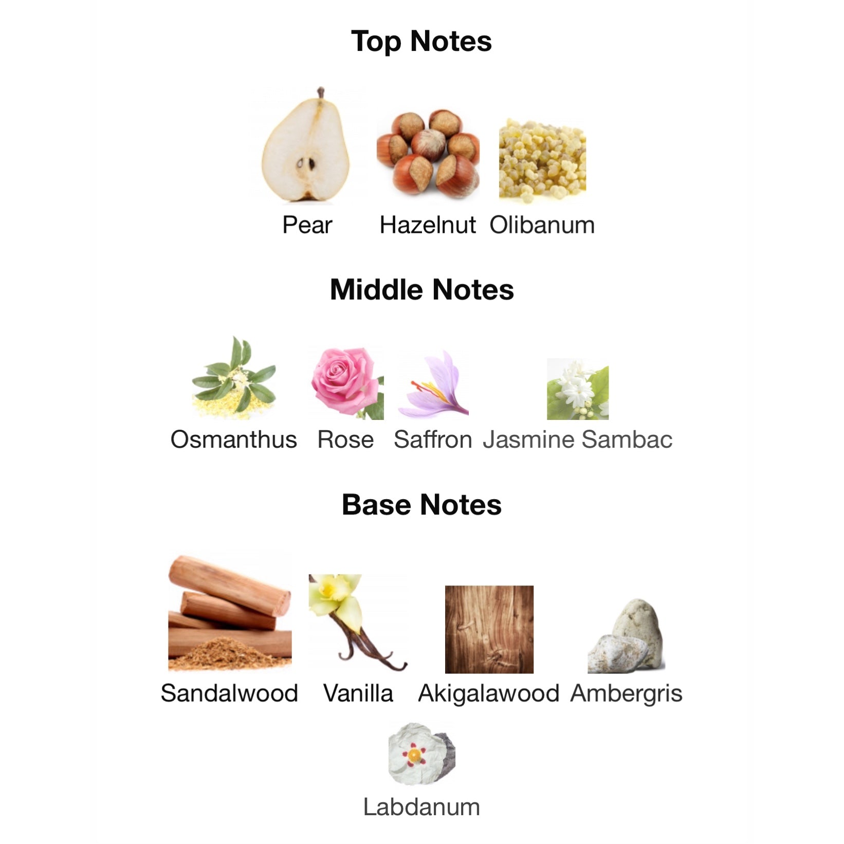 Top notes are Pear, Hazelnut and Olibanum; middle notes are Osmanthus, Rose, Saffron and Jasmine Sambac; base notes are Sandalwood, Vanilla, Akigalawood, Ambergris and Labdanum.